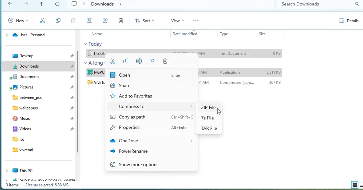 要在 Windows 11 中创建 7-zip 或 TAR 存档文件,只需执行以下步骤: