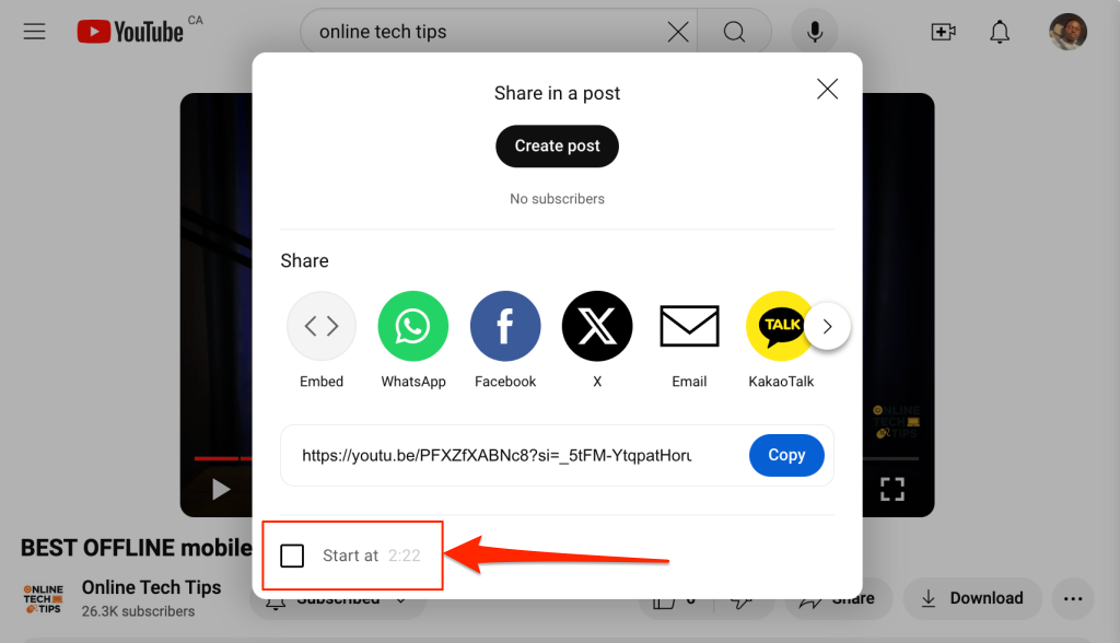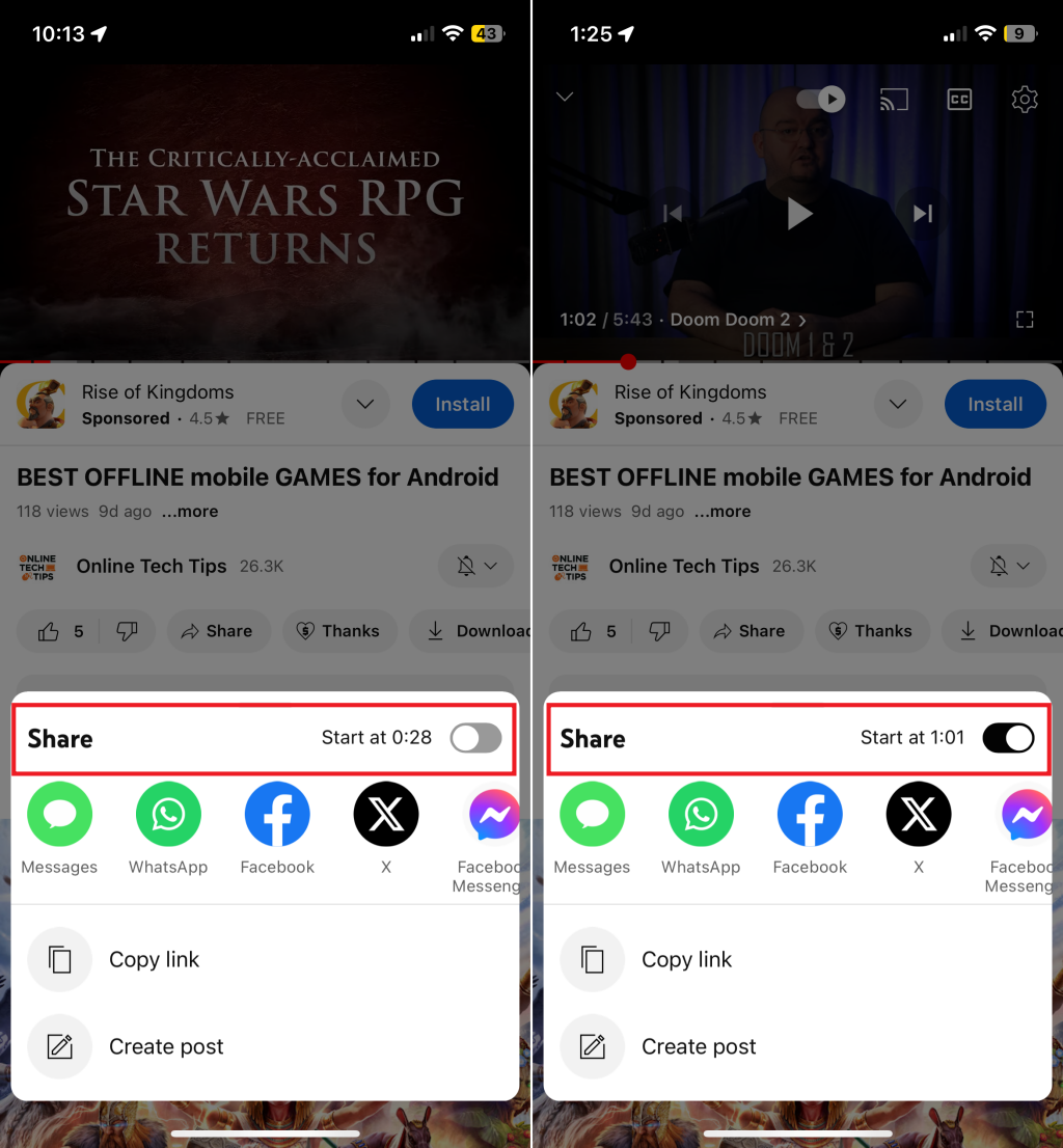 YouTube现在在共享表上有一个时间戳切换。现在,用户可以共享以按下共享按钮的确切点开始播放的视频。时间戳切换具有“在HH:MM:SS”标签上,其中HH,MM和SS分别代表小时,分钟和第二个标签。