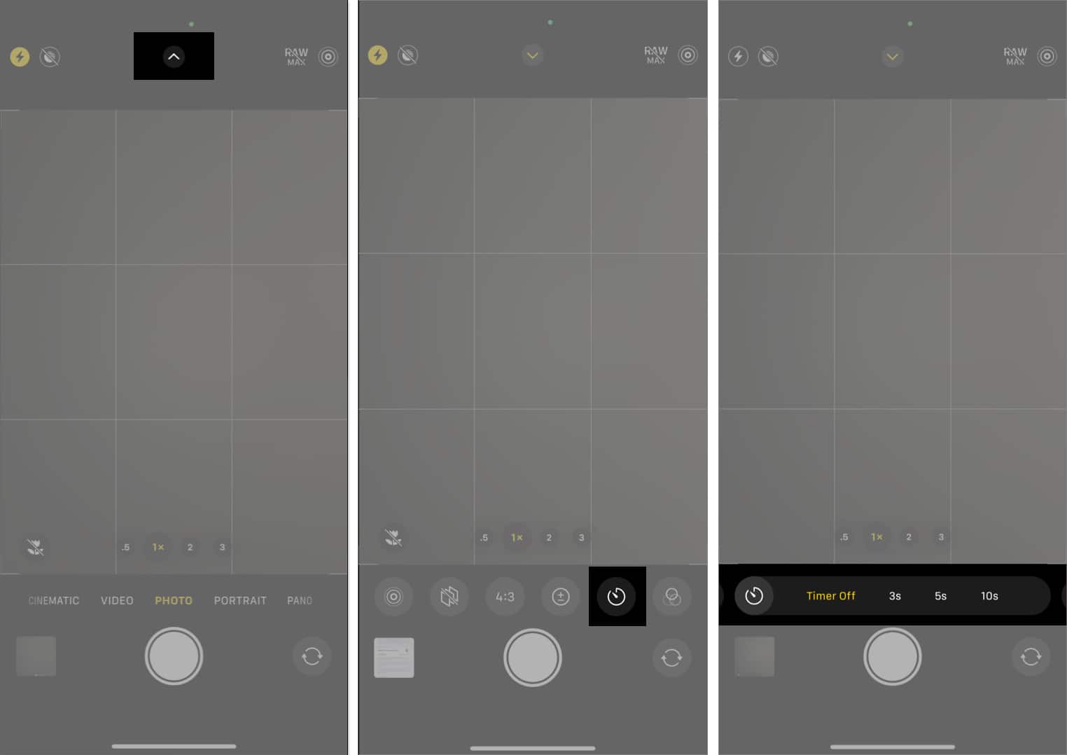 要使用 iPhone 相機定時器,請打開相機應用程序並向上滑動。現在,在新的選項托盤中,點擊定時器圖示.您現在可以選擇3秒,5秒, 或者10秒延遲。設置好鏡頭,按下快門按鈕,相機就會在拍照前倒計時。