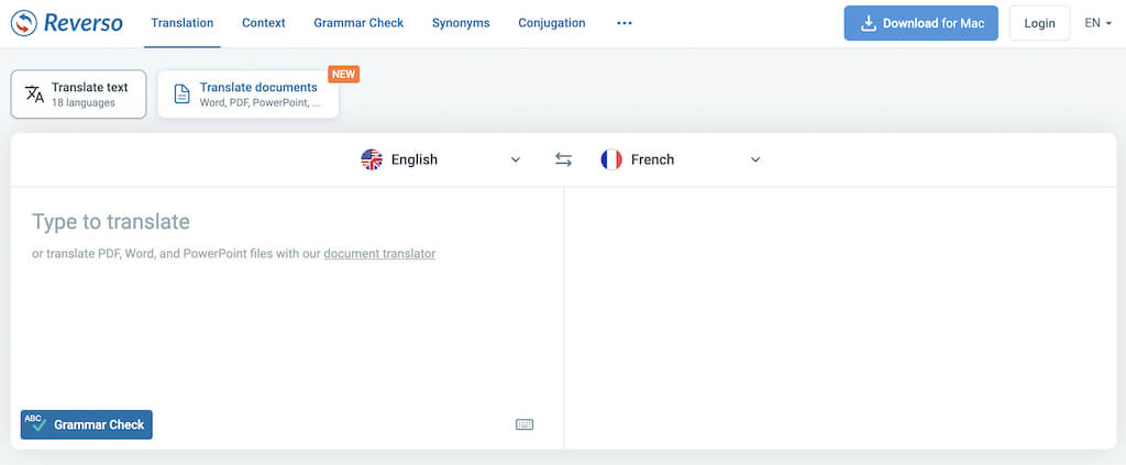 您可以使用Reverso 將文本編寫並翻譯成18 種語言,包括阿拉伯語、中文、希伯來語和烏克蘭語。您可以使用翻譯工具將文本粘貼到網站上并快速翻譯,或者將文本作為文件上傳,然後下載翻譯後的文檔。
