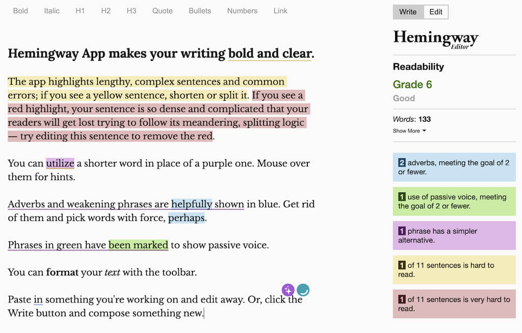 海明威應用程序是 Grammarly 的另一個絕佳替代品。如果您想要一個具有簡約界面的簡單應用程序來糾正您的語法和拼寫錯誤,並幫助您修復過於復雜的句子,那就不用再猶豫了。該網絡工具使用顏色編碼的建議來改進您的寫作風格和語法。顏色編碼系統在編輯和校對方面也很有效。該應用程序會突出顯示副詞、被動語態、陳詞濫調和其他讓您聽起來不自然的單詞。