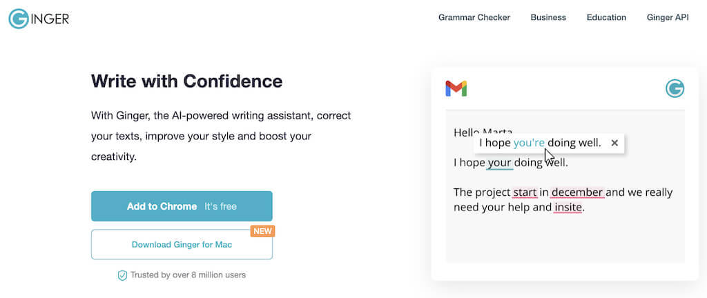 如果您正在尋找一款無論使用哪個平台或設備都可以幫助您糾正語法錯誤的應用程序,請嘗試一下 Ginger。除了糾正語法錯誤和拼寫錯誤之外,Ginger 還可以幫助您寫得更好。該應用程序使用人工智能來建議替代方案,以更好地傳達您想要的信息。對於非英語使用者來說,該工具也是一個絕佳的選擇,因為 Ginger 使用自然語言處理來幫助您掌握基本的語法和標點符號規則。