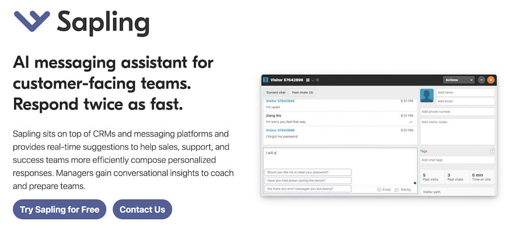 Sapling 是一款語法檢查器和寫作助手,對客戶支持和銷售領域的任何人都非常有幫助。該工具使用人工智能來糾正電子郵件、社交媒體帖子和聊天消息中常見的語法和拼寫錯誤。有了 Sapling,您不必擔心再次檢查與客戶的通信,因此可以以兩倍的速度回答他們的詢問。