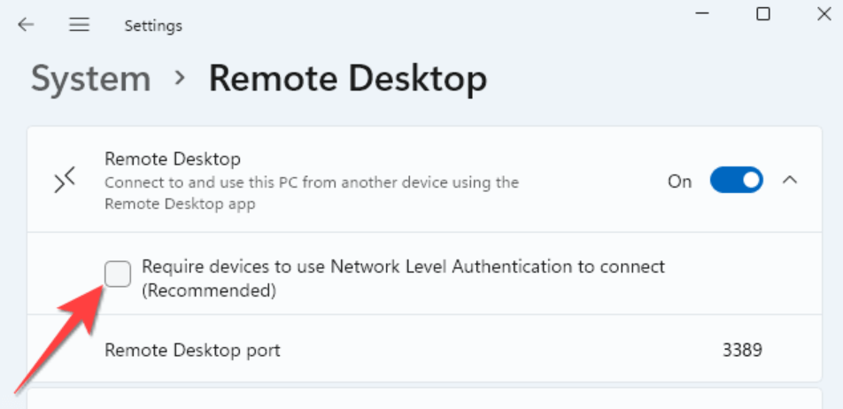 步驟 2 =確保選中要求設備使用網絡級身份驗證進行連接(推薦)旁邊的框。