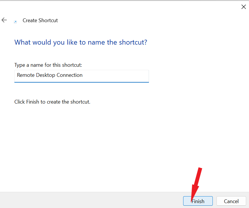 - 現在輸入遠程桌面連接當詢問快捷方式的名稱時,單擊“完成”