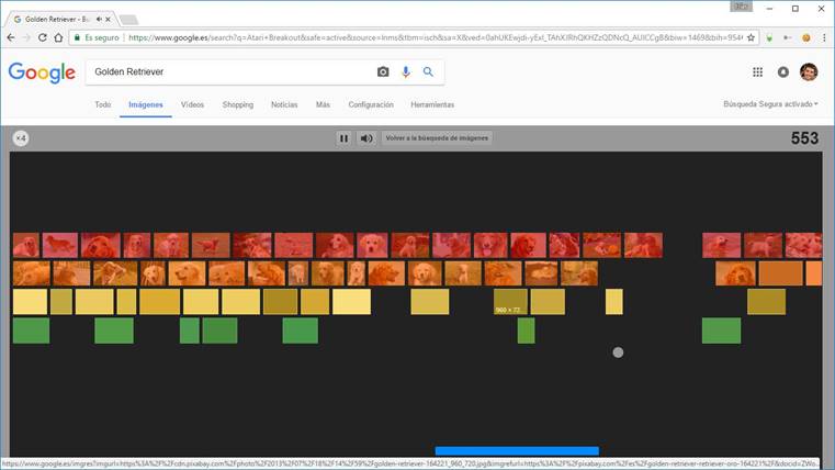 Atari Breakout 與此列表中的其他遊戲有所不同,因為這款“遊戲”是通過 Google 圖片進行的。您需要搜索“Atari Breakout”並轉到“圖像”選項卡,這將使搜索結果中的所有圖像轉換為我們需要打破才能贏得遊戲的塊。我們可以使用遊戲上方的按鈕返回到通常的圖像搜索。