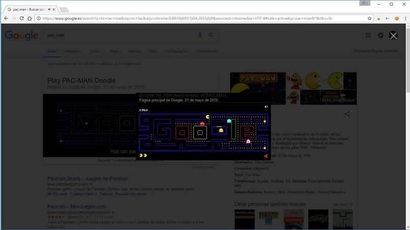 即使是強大的吃豆人也可以在 Google 搜索中找到,只要輸入“吃豆人”,我們就可以玩 80 年代初最具傳奇色彩的遊戲之一。要玩遊戲,請使用鍵盤箭頭,在不被四個幽靈中的任何一個碰觸的情況下吃掉所有水果並贏得遊戲。在 Google 搜索的版本中,我們只有一個級別可用,這與原始遊戲有很多不同的階段相反。