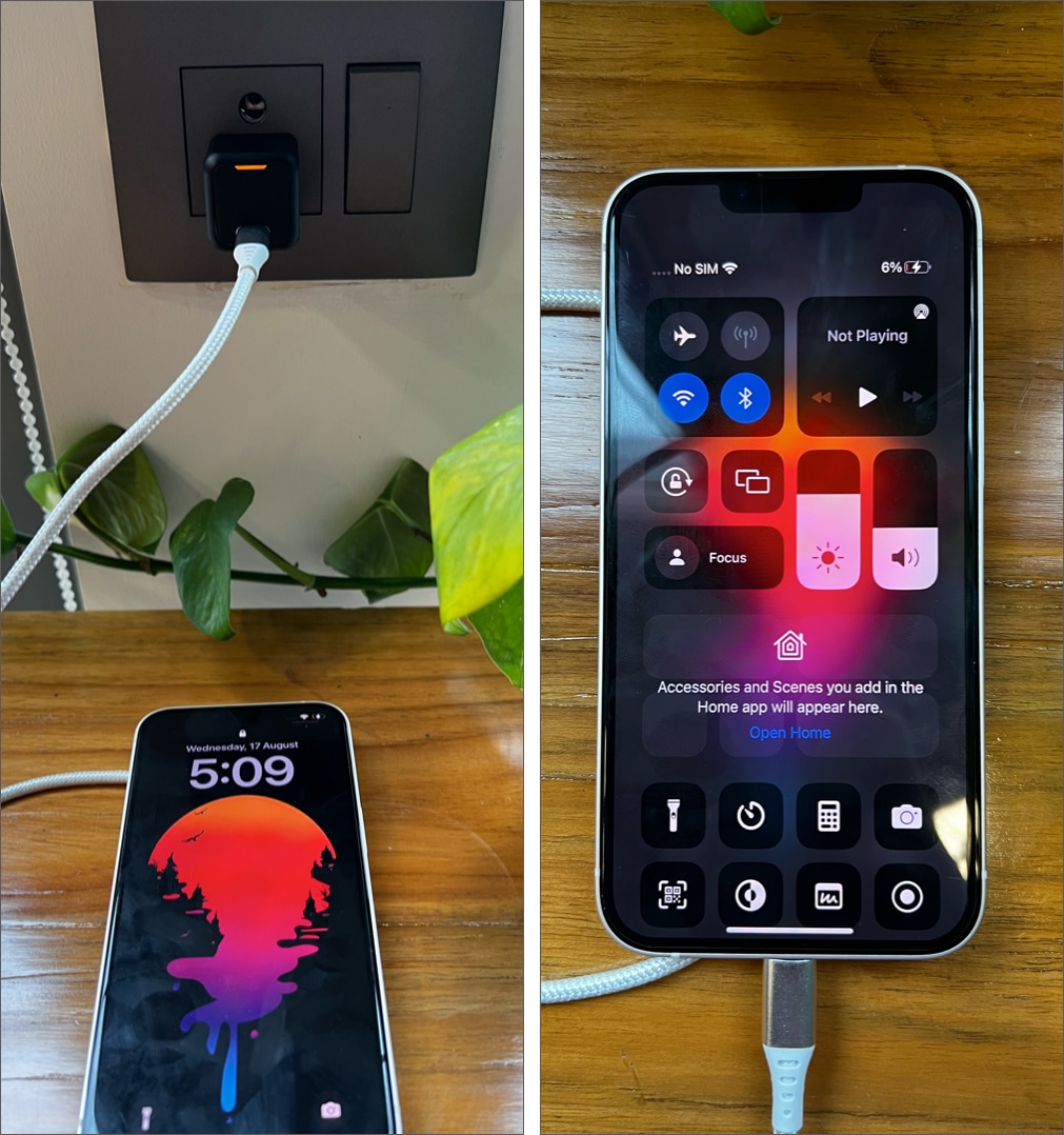 現在讓我們看看充電速度。我用 iPhone 13 測試了 MagCube 30W 充電器。我在下午 05:09 開始測試,當時手機電量為 6%。 05:39 半小時內,電量為 59%。 30 分鐘內充電超過 50%,與蘋果聲稱的 18W 原裝充電器相當。