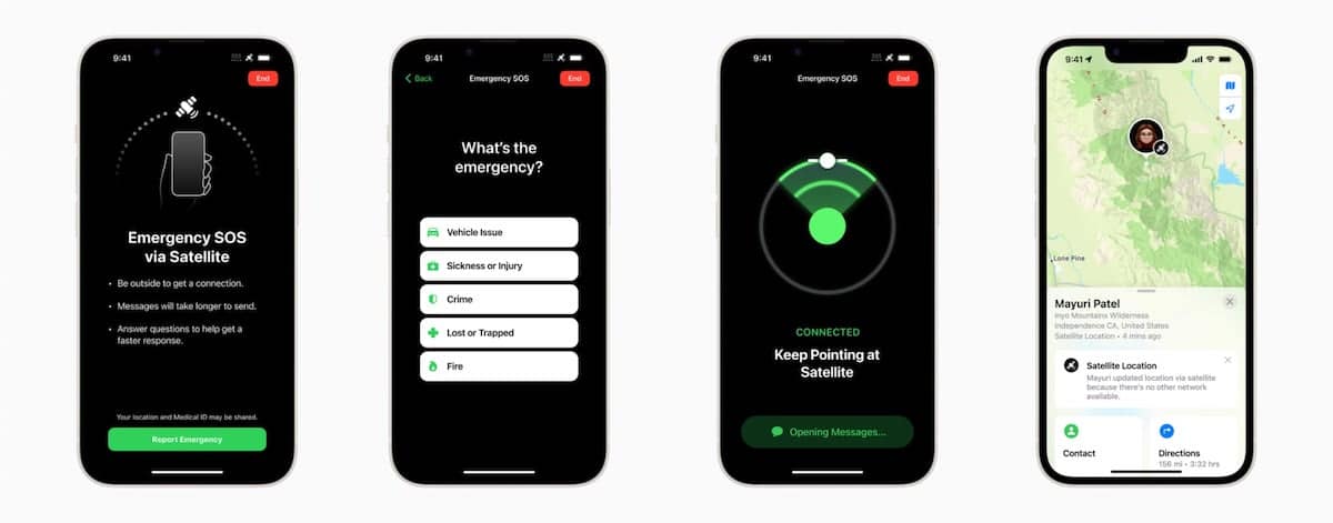 2022 年 11 月,蘋果在美國和加拿大的 iPhone 14 機型上通過衛星推出了緊急求救功能,隨後擴展到英國、法國、愛爾蘭、意大利和德國等其他地區。該服務允許用戶在沒有蜂窩網絡和 Wi-Fi 覆蓋的地區連接緊急服務。