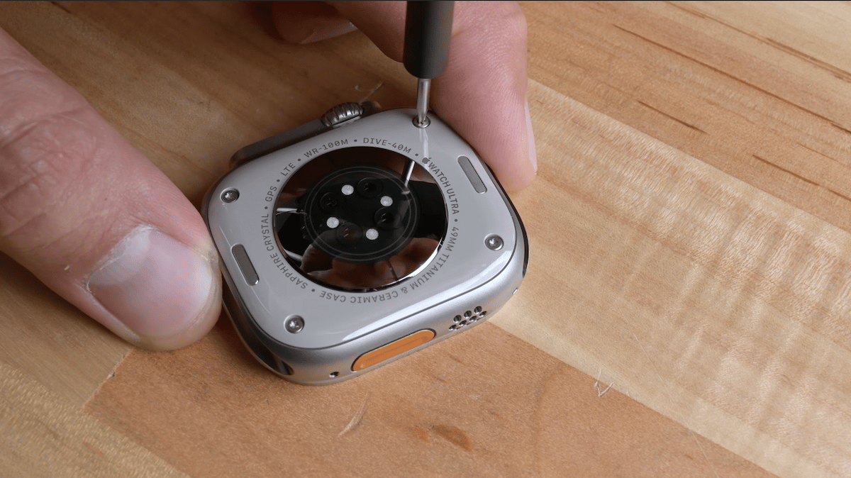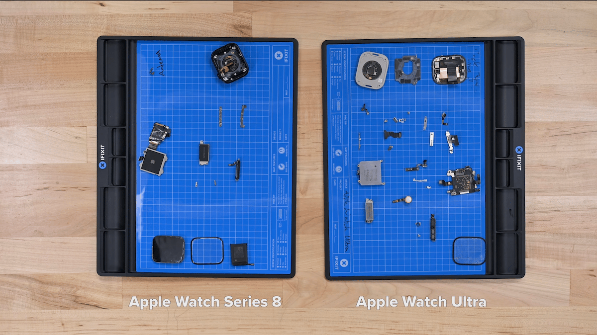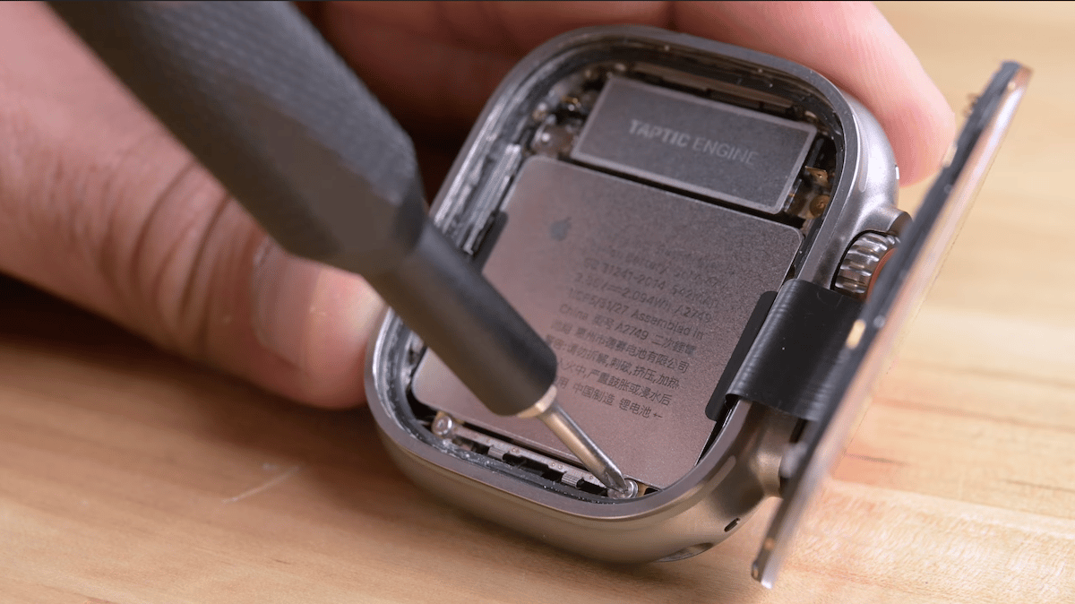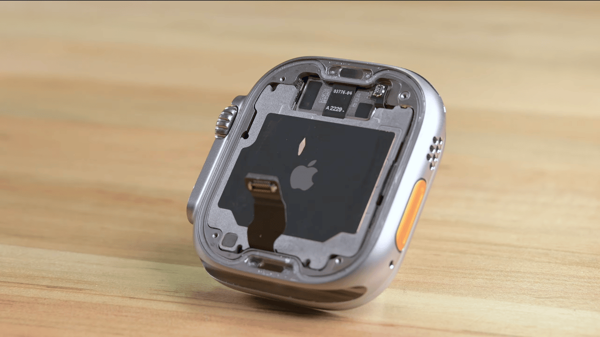 卸下屏幕時,iFixit 專家破解後顯示,消費者將需要蘋果授權服務提供商提供維修服務,這些服務提供商經過培訓並擁有維修 Apple Watch Ultra 屏幕和電池所需的工具。