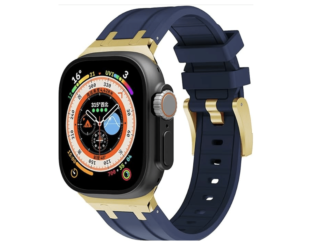 MRYUESG 提供錶帶適用於 Apple Watch Ultra 2,配有金色和銀色連接器以及採用優質矽膠和不銹鋼製成的帶扣,經久耐用且佩戴舒適。