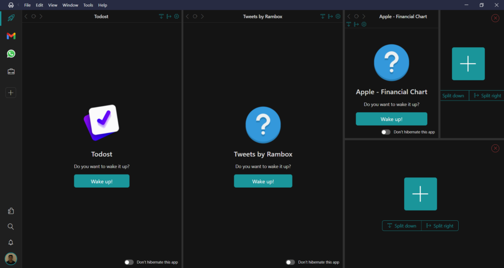 它還可以讓你拆分這些現有部分進入多個其他部分,將您最喜歡的應用程序和服務添加到其中。我們喜歡 Rambox 的一件事是它可以讓您更改界面主題淺色、深色、石板色和光澤。回到它的主要功能。 Rambox 讓您添加和管理您的所有 Gmail 帳戶在一個屋簷下。