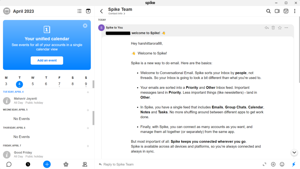 繼續前進,Spike 還配備了本地日曆讓您可以在同一屋簷下跟踪所有活動。創建新事件後,它們會顯示在本機日曆中。總而言之,Spike 是一款出色的電子郵件客戶端,免費提供所有基本功能。