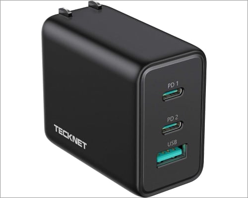 TECKNET 65W GaN 壁式充電器提供 2 個 USB-C PD 3.0 端口和 1 個 USB-A 端口。得益於內置 PPS 技術,您的 MacBook Pro 將在兩小時內通過單個 USB-C 端口從 0% 充電至 100%。它比典型充電器小 50%。此外,GaN技術降低了充電器的尺寸、重量、發熱量和功耗。