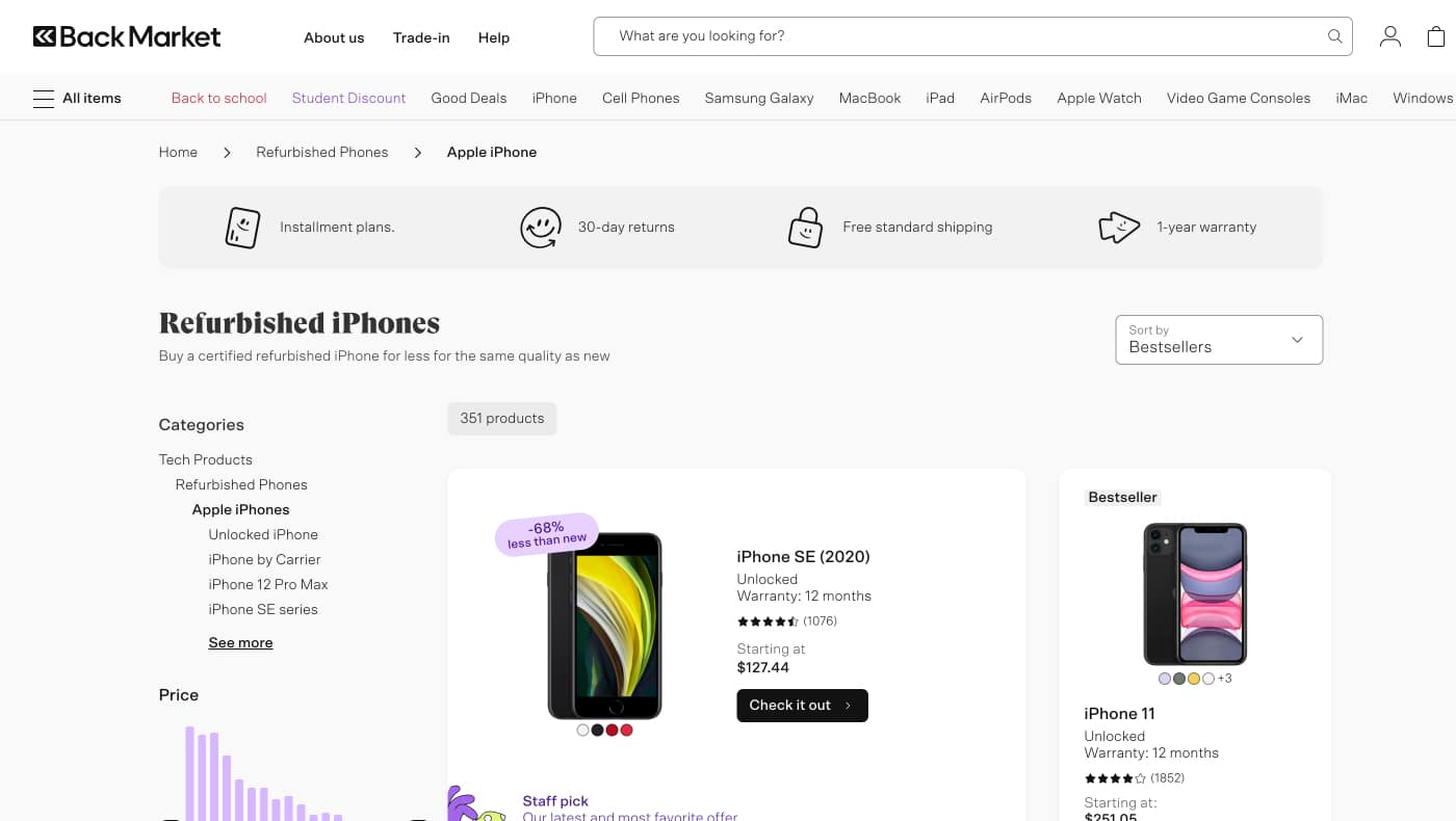 Back Market 可讓您購買各種條件(優秀、良好和一般)的翻新 iPhone,以滿足您的預算。它還提供專家檢查認證、1 年保修、30 天免費退貨政策和每月分期付款計劃。