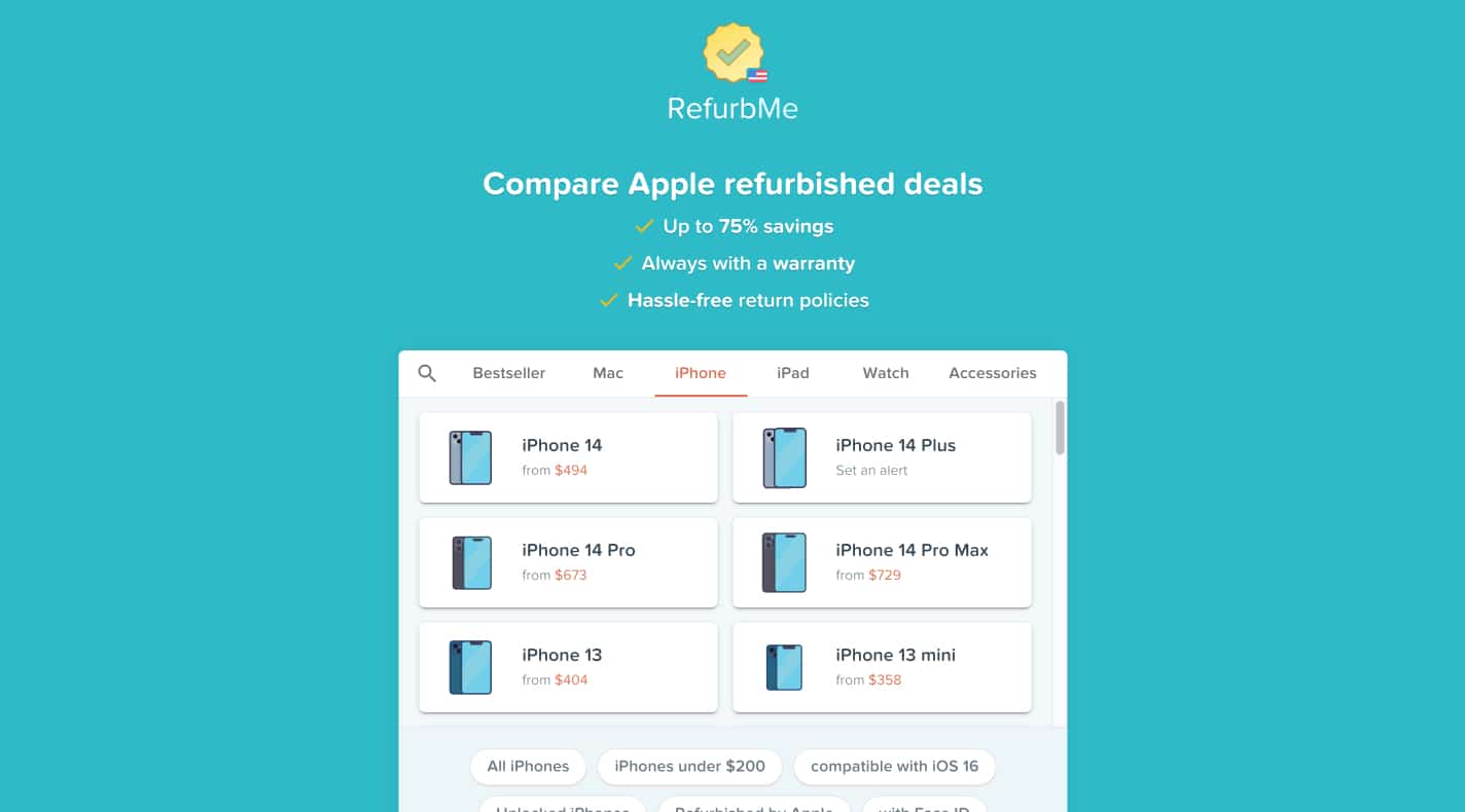 RefurbMe 是一個市場,您可以在一個地方看到所有值得信賴且經過認證的翻新 iPhone 賣家。因此,您可以比較價格並節省高達 75% 的費用。