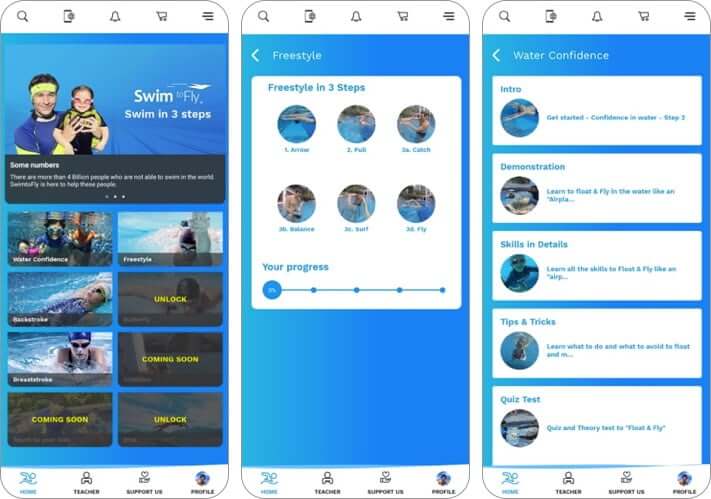 由於每節課都包含視頻,您可以輕鬆學習游泳技巧。更不用說,SwimtoFly 還可以讓您記錄您的游泳距離並跟踪完成情況,以便您可以檢查自己的游泳情況。