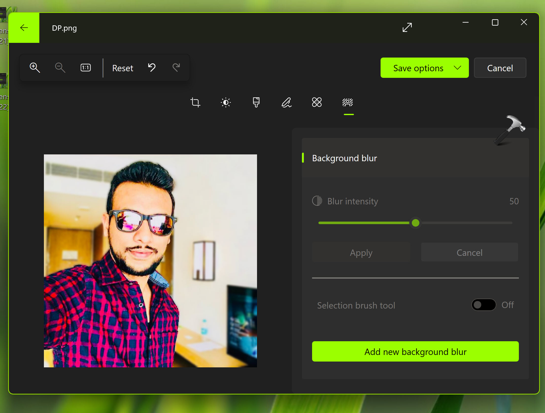 現在,照片應用程序將自動檢測圖像的背景。現在可以自動或手動應用背景模糊效果。您可以根據您想要的背景模糊程度手動設置模糊強度。此外,您可以在此處打開選擇畫筆工具選項並選擇畫筆工具。一旦您對背景模糊感到滿意,您可以單擊“應用”按鈕。