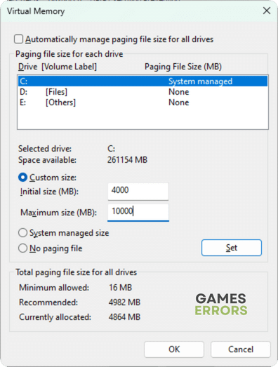 - 取消選中自動管理所有驅動器的分頁文件大小並勾選定制尺寸。