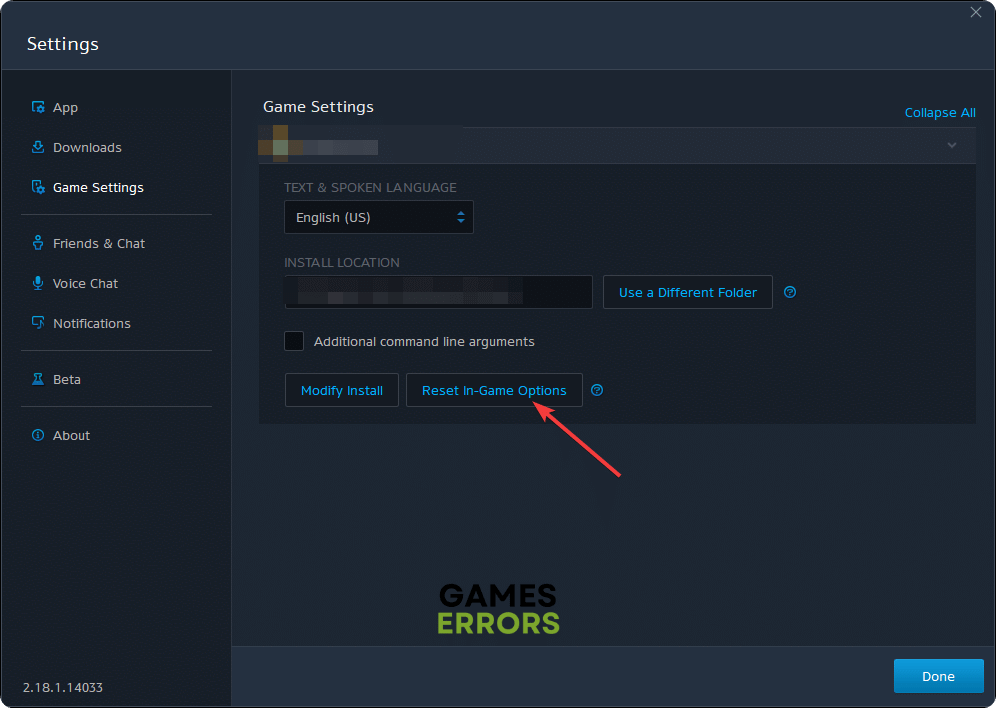 - 接下來,單擊重置遊戲內選項並完成該過程。
