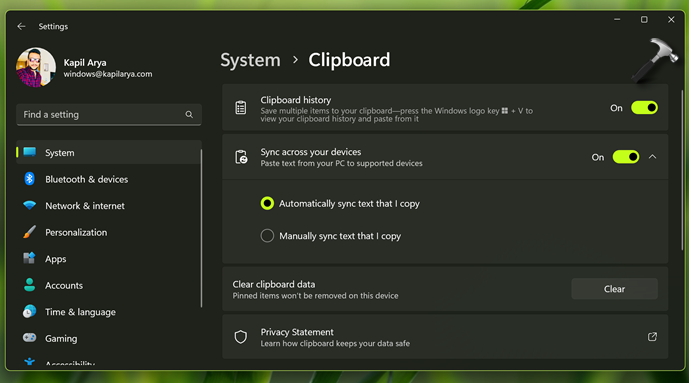 您可以使用“設置”應用程序或通過註冊表在設備之間啟用剪貼板同步。請注意,每個複制項目的剪貼板歷史記錄大小最大為 4 MB。剪貼板歷史記錄的複制條目數上限為 25 個。為了使剪貼板同步無縫運行,請保持使用您的 Microsoft 帳戶的登錄狀態。