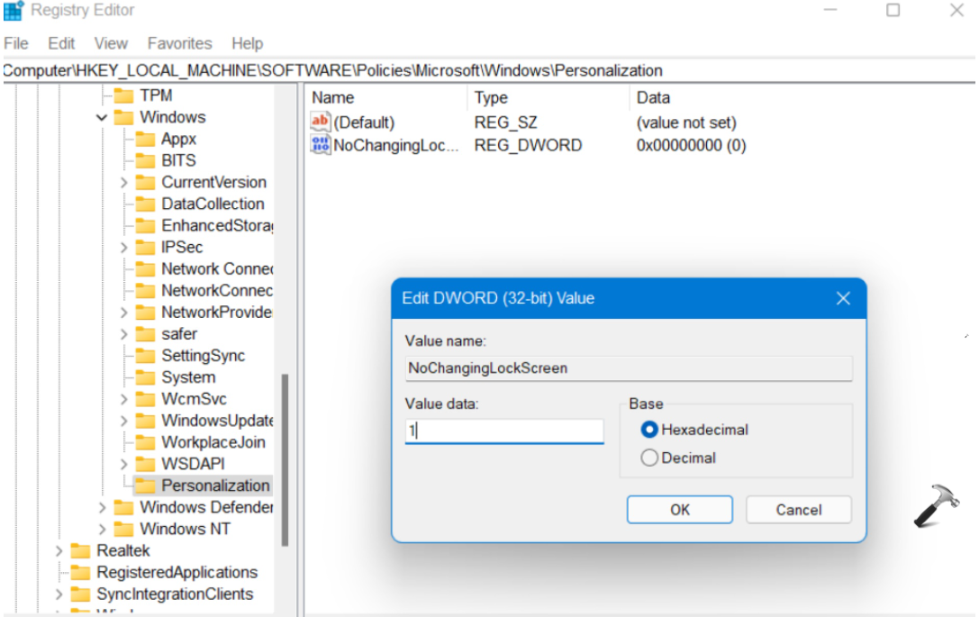 3.到達那里後,雙擊禁止更改鎖屏現在,將其值數據更改為1用於禁用更改鎖定屏幕背景。最後,點擊好的。