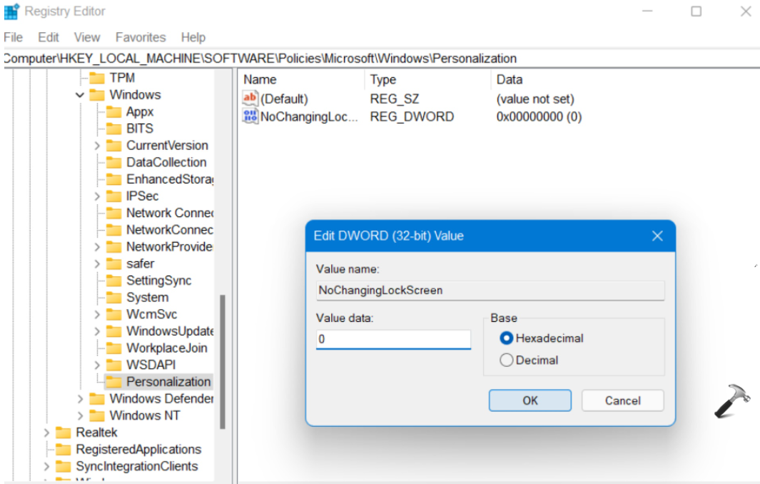 3.到達那里後,雙擊禁止更改鎖屏現在,將其值數據更改為0用於啟用更改鎖定屏幕背景。最後,點擊好的。