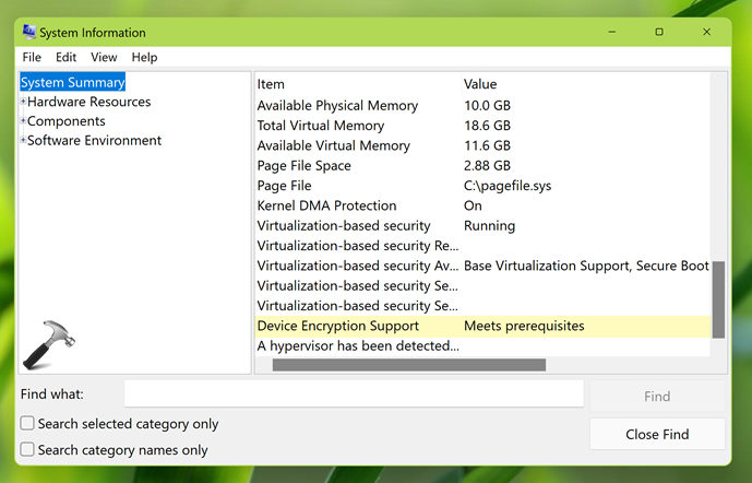 如今,大多數設備都支持設備加密功能。要檢查您的設備是否支持它,您需要訪問開始菜單 > 所有應用程序 > Windows 工具。右鍵單擊系統信息並選擇以管理員身份運行。當“系統信息”窗口打開時,在“系統摘要”上,向下滾動並找到設備加密支持。如果它的值是滿足先決條件,然後您可以在系統上啟用設備加密。否則,您將無法啟用它,因為該功能將完全丟失。