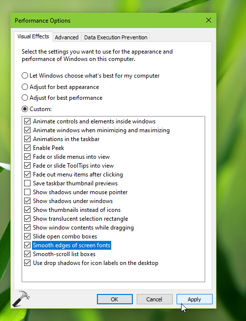 3.接下來,在“性能選項”窗口的“視覺效果”選項卡上,選擇風俗。然後取消選中屏幕字體邊緣平滑在 Windows 10 中禁用字體平滑。或者選中相同的選項以啟用字體平滑,這也是默認設置。點擊申請,好的。