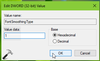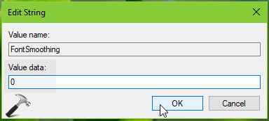 4.將值數據設置為0禁用字體平滑。點擊好的。同樣,雙擊FontSmoothingType註冊表 DWORD (REG_DWORD) 並將其值數據設置為1再次禁用字體平滑。點擊好的並關閉註冊表編輯器。
