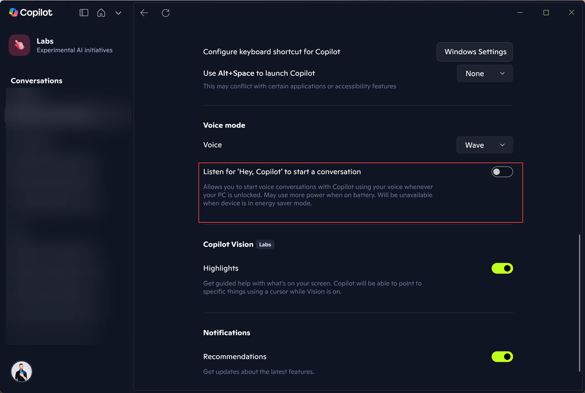 - 關閉開關可阻止 Copilot 監聽喚醒短語。