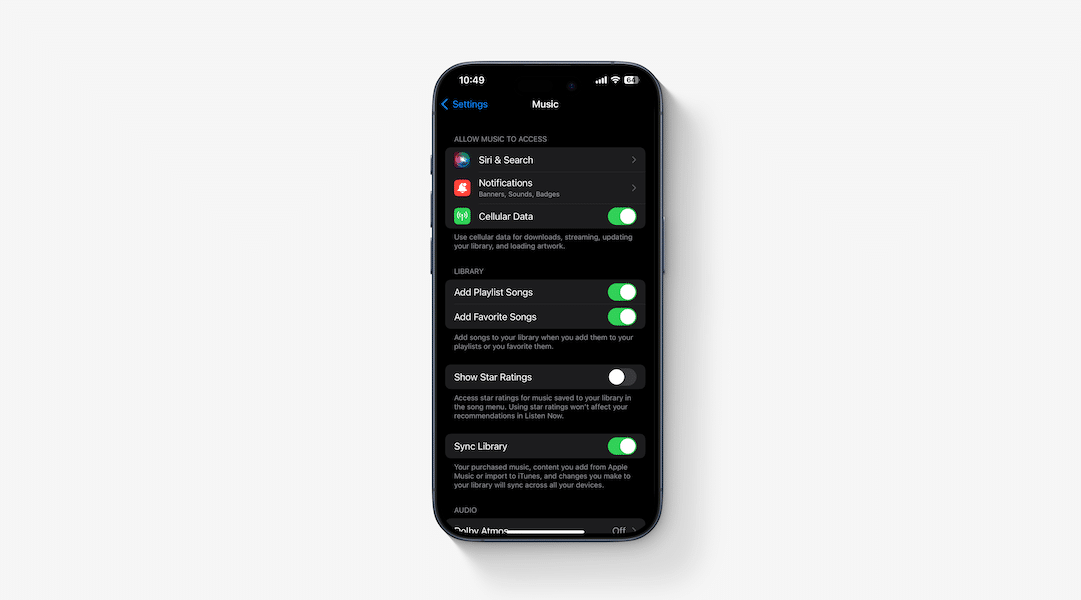 - 添加最喜歡的歌曲 切換添加到“設置”應用程序的 Apple Music 設置中。打開後,它會自動將最喜愛的歌曲添加到您的曲庫中。