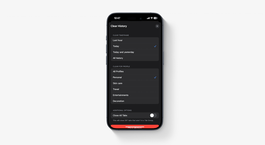 - 清除歷史記錄設置在 Safari 中不會改變。如果您選擇特定的時間範圍,應用程序將記住並保持不變。以前,當用戶關閉應用程序時,“清除歷史記錄”設置會恢復為默認設置。