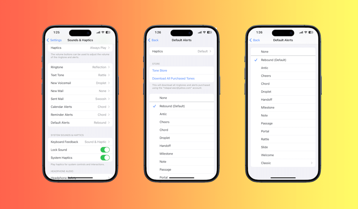 - 警報默認聲音。在“設置”應用程序的“聲音和触覺”部分中,添加了新部分“默認警報”,用戶可以選擇默認通知警報聲音,包括經典、自定義和其他鈴聲。以前,反彈是唯一無法更改的默認警報聲音。