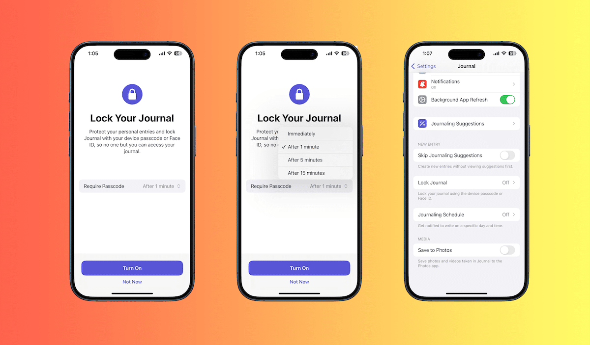 - 鎖定您的日記啟動畫面日記應用程序中的通知用戶可以鎖定應用程序以保護其條目免遭窺探。添加啟動屏幕是因為鎖定應用程序的選項位於“設置”應用程序 >“日誌”中,而不是應用程序中的任何位置。