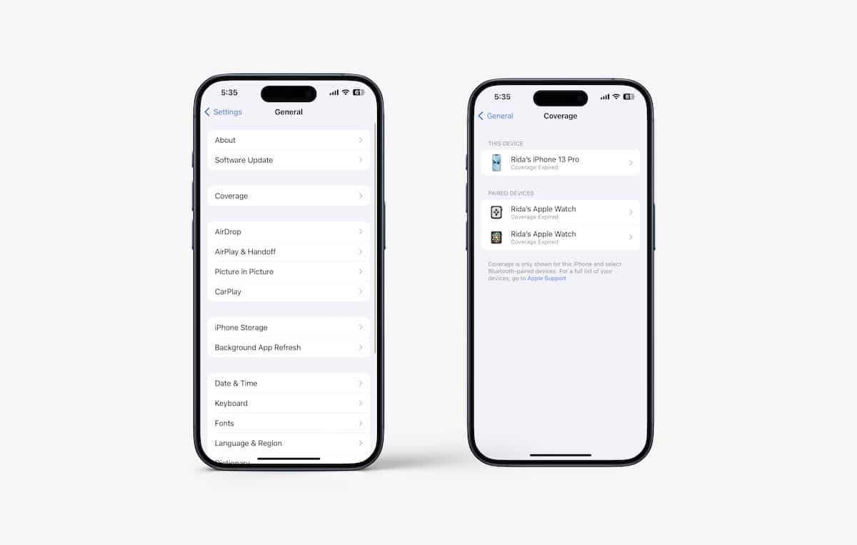 - “設置”應用程序中的“常規”中添加了新的“覆蓋範圍”部分。用戶將找到有關 AppleCare 保修期內和保修期外的所有 Apple 設備的信息。