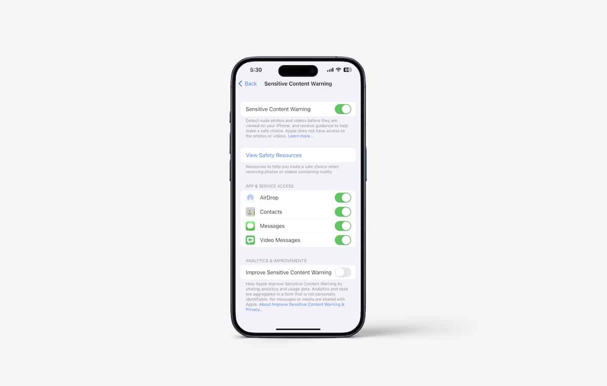 - 設置應用程序中的隱私和安全部分將敏感內容警告擴展到聯繫人。啟用後,該功能將模糊通過 NameDrop 共享的聯繫人海報和 iMessage 貼紙中的露骨圖像。