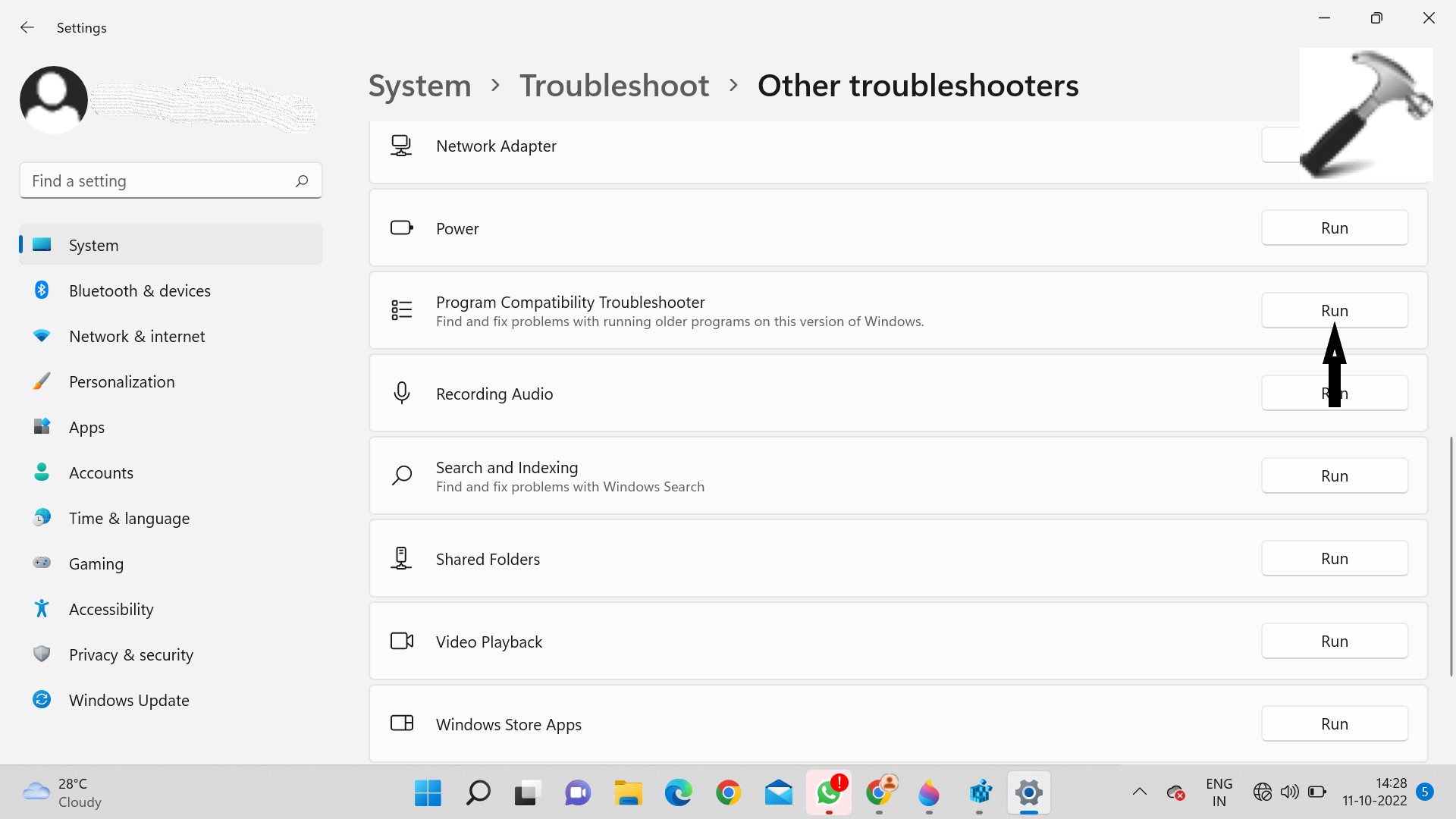 4. 現在,向下滾動並單擊跑步旁程序兼容性疑難解答。