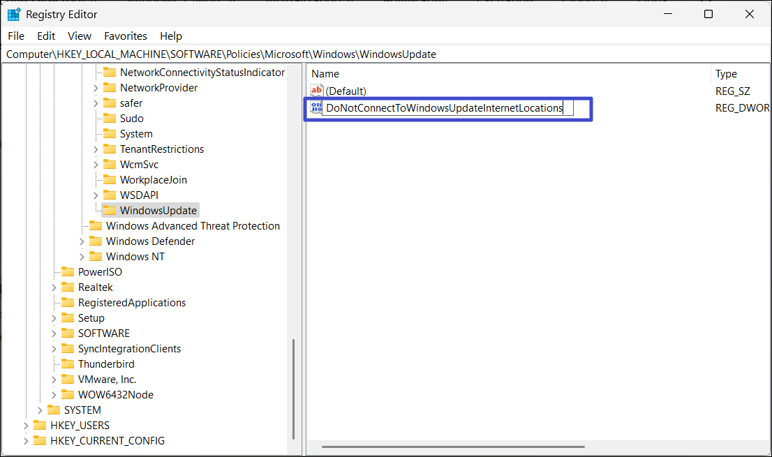 6. 將值重命名為“不連接到 Windows 更新 Internet 位置”。
