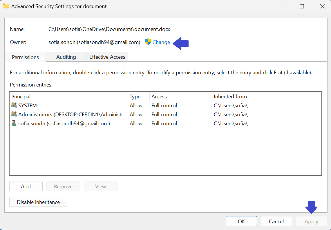 8. 您將注意到所有者的姓名已更改為您的姓名,然後單擊“應用”。在警告消息中,單擊“是”繼續此操作。單擊“確定”兩次即可完成權限更改過程。