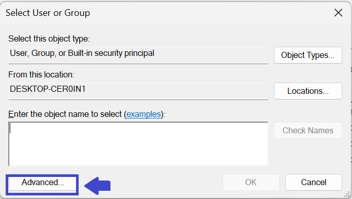5. 在“選擇用戶或組”窗口中,單擊“高級”按鈕。