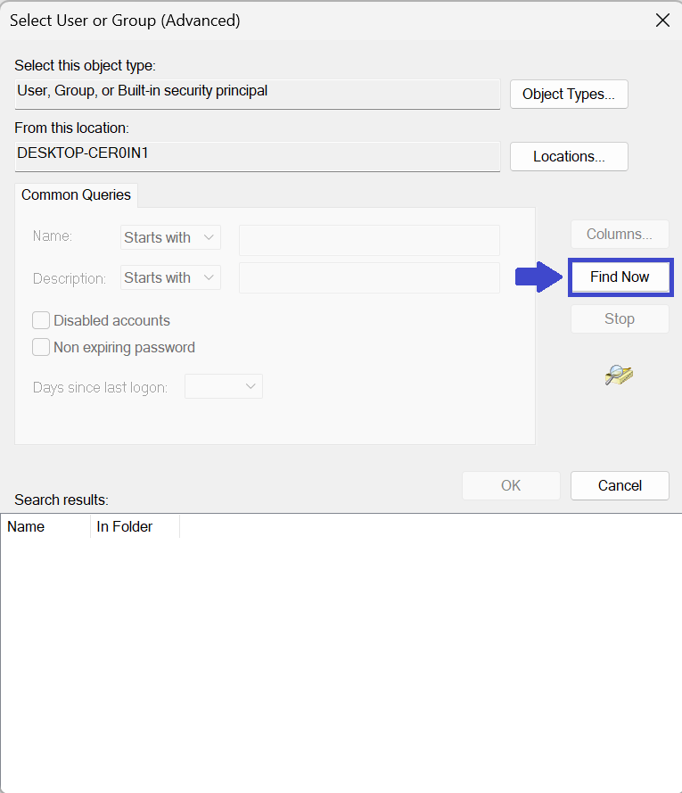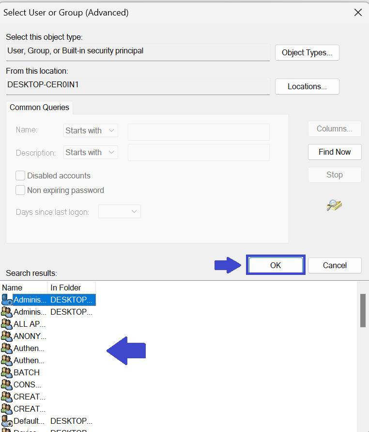 7. 在下面顯示的搜索結果中,在列表中搜索您的姓名並選擇它。單擊“確定”。返回“選擇用戶或組”窗口,單擊“確定”確認對象名稱。