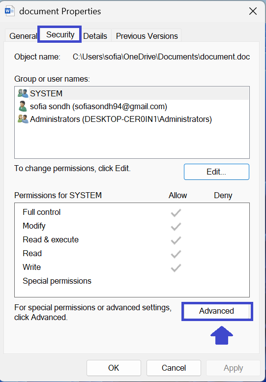 3. 在上圖中,您將看到您無權對該文件進行任何更改。要獲得文件的所有權,請單擊“高級”按鈕。