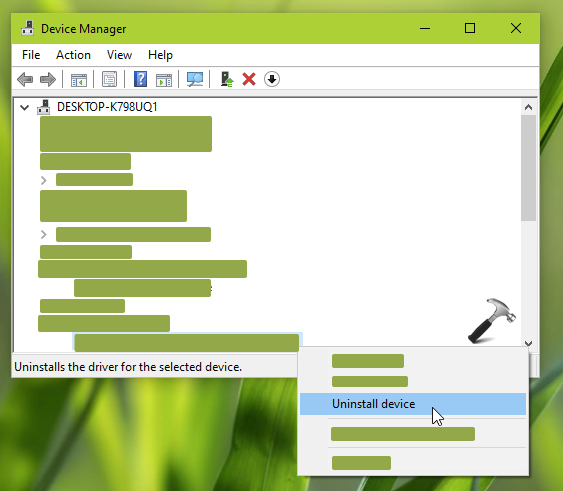 此問題最常見且有效的解決方案是重新安裝設備。為此,您可以轉到設備管理器並右鍵單擊錯誤代碼為 31 的設備。在上下文菜單中,選擇卸載設備。點擊好的在確認提示中。