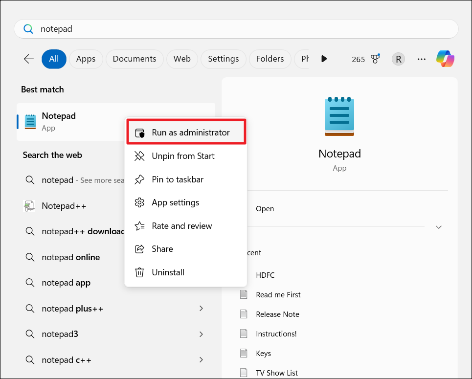 1. 搜索 '記事本' 在開始菜單中,然後右鍵單擊結果並選擇 '以管理員身份運行'。