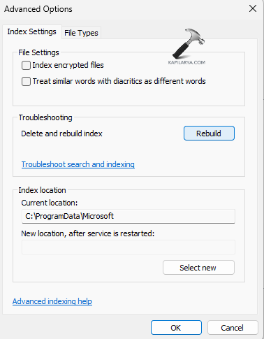 步驟 4-現在,按“高級選項”窗口中的“重建”選項。如果出現任何提示,請按“確定”。等待索引完成。