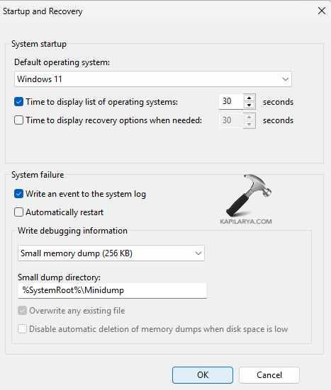 步驟 4-此外,在系統故障下方,取消選擇自動重新啟動。最後,按確定。