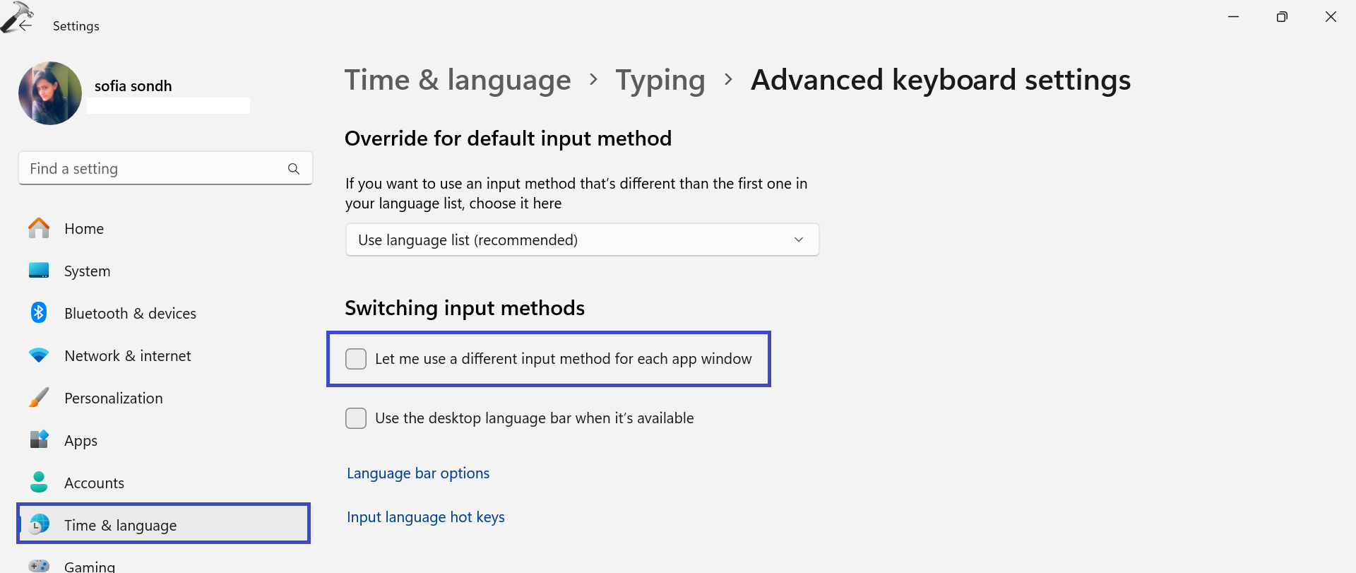 4. 在“切換輸入法”部分,檢查“讓我為每個應用程序窗口使用不同的輸入法“ 盒子。