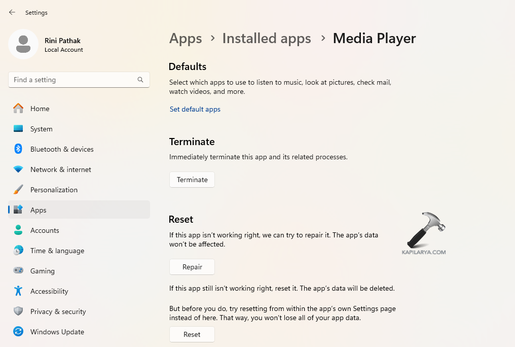 步驟1-首先,打開“設置”>“應用程序”>“已安裝的應用程序”>“Windows Media Player”。