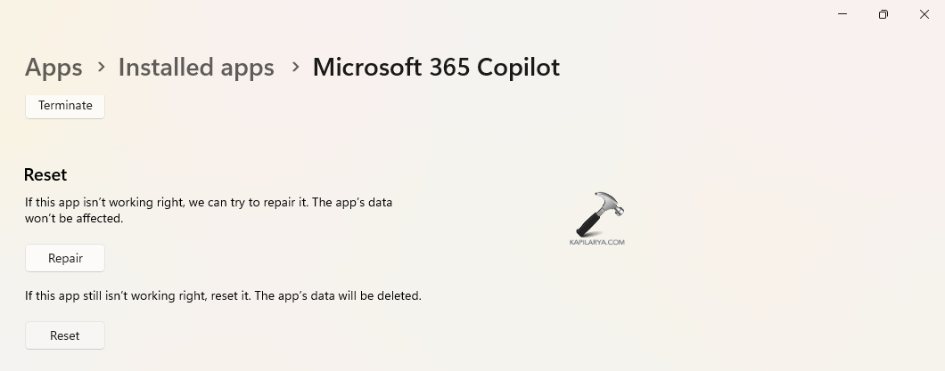 步驟 3 –向下瀏覽並選擇任何選項,包括修復、重置甚至根據要求卸載。如果需要,也可以選擇所有三個。該過程完成後,檢查錯誤是否已修復。